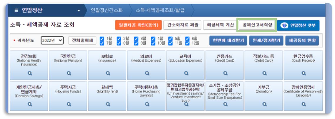 먼저 위 스냅숏에 표시한 "공제신고서 작성"버튼을 클릭해 주세요.