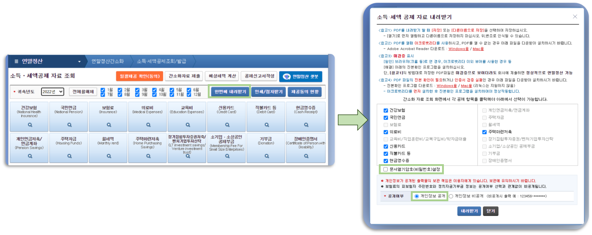 글의 맨 위에서 소개한 "편리한 연말정산" 메뉴에 들어가면 왼쪽 화면이 나옵니다.
