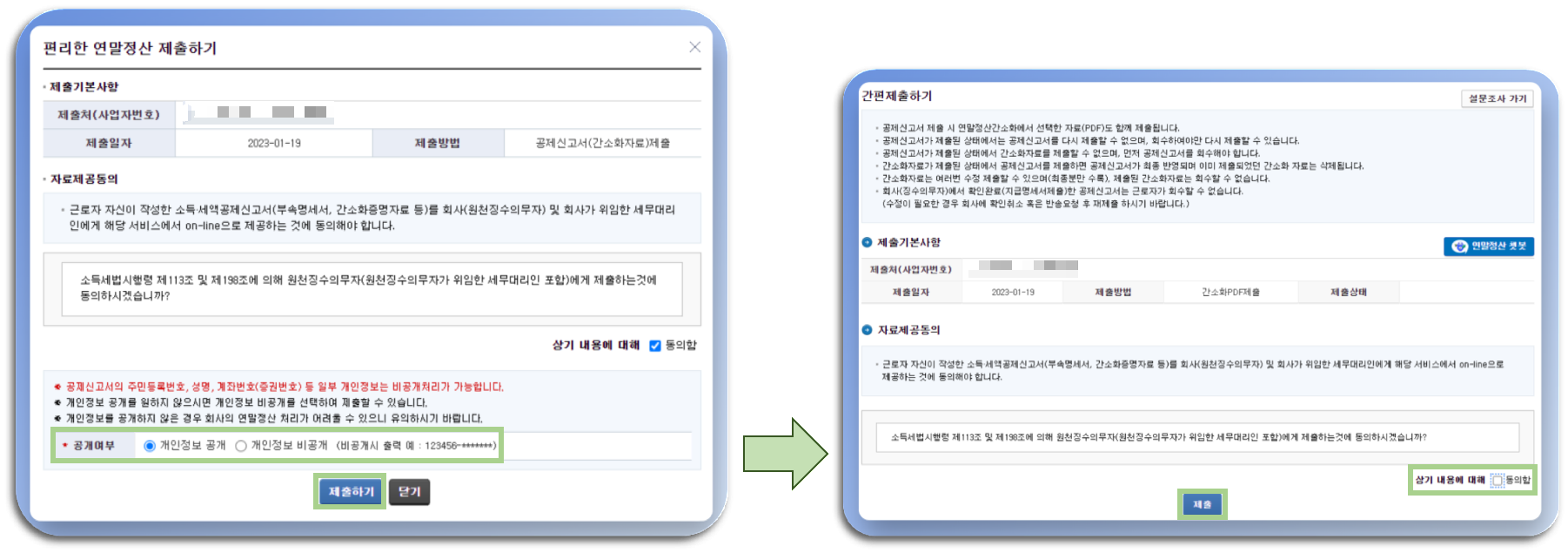 연말정산 간소화의 자료를 회사에 일괄제공함을 동의하는 과정입니다.
