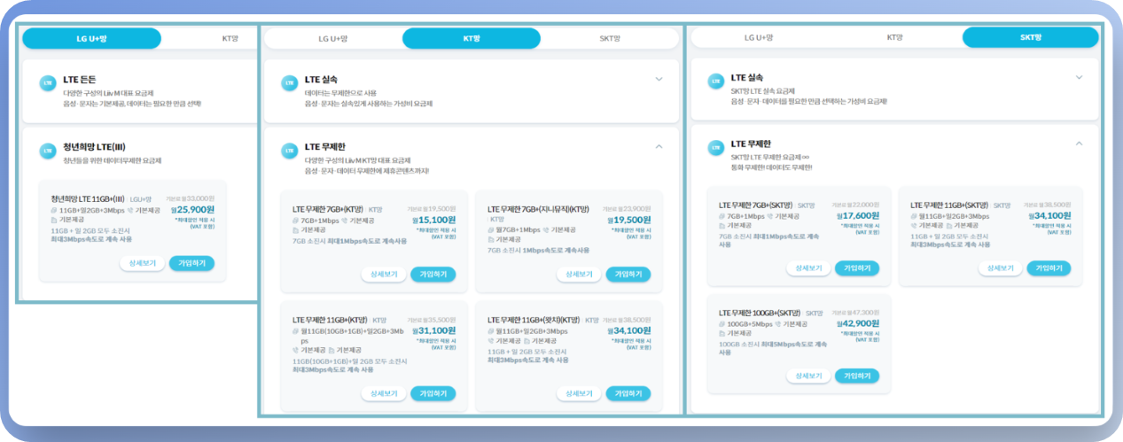 그리고 위 스냅숏처럼 3개 통신사 망을 이용한 요금제 중 골라서 가입할 수 있습니다.