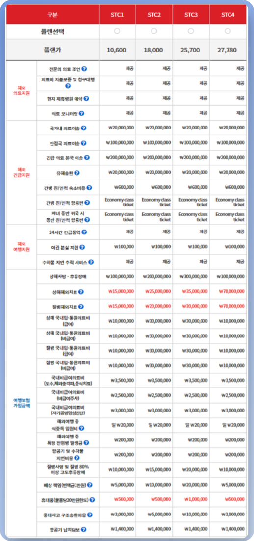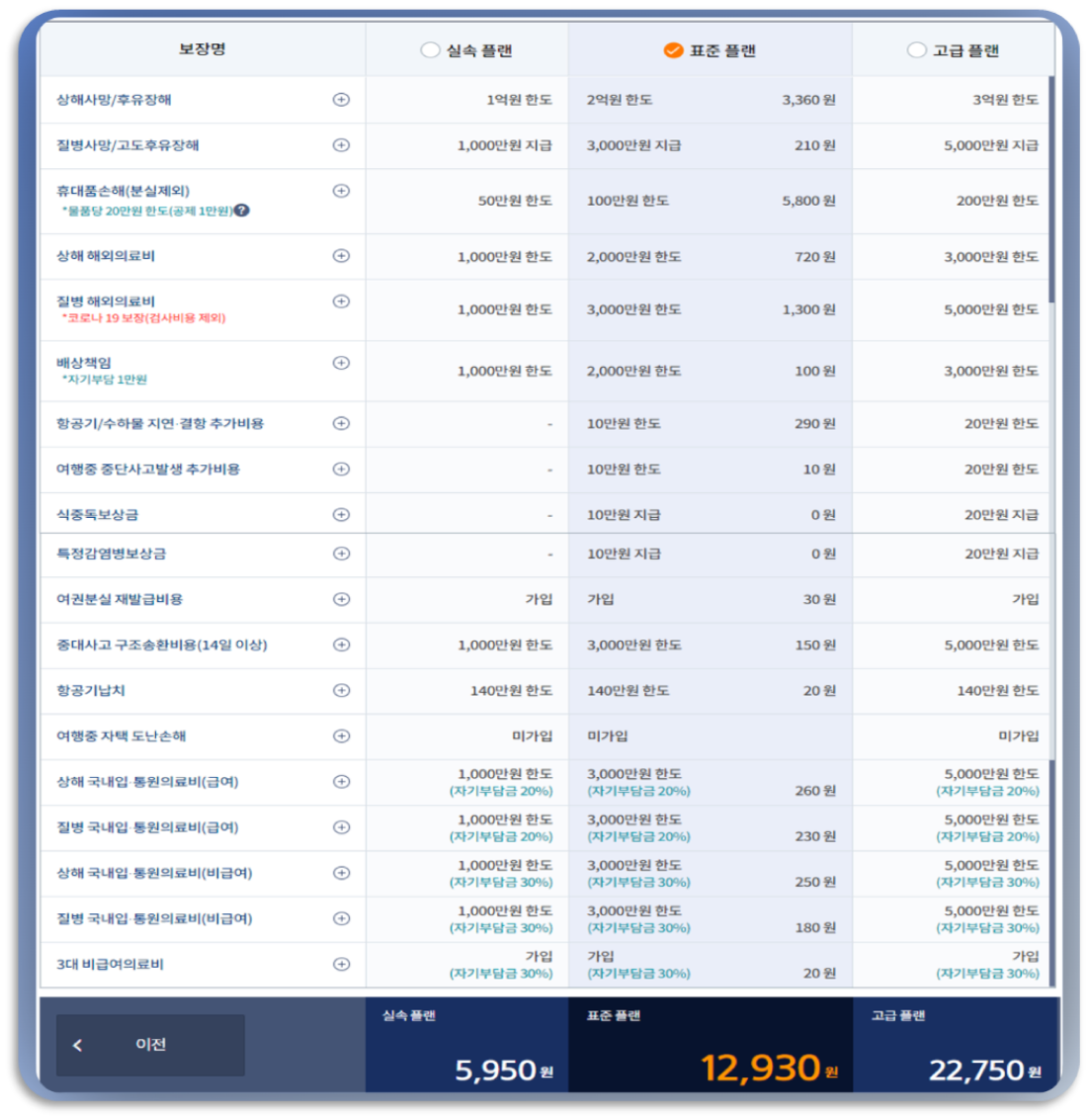 총 4개의 플랜이 있으며, 앞서 소개한 여행자 보험과 비교해 보면 다른 점이 몇 가지 보입니다.