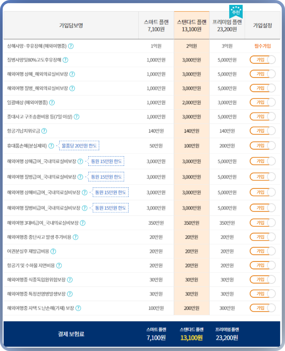 총 3개의 플랜이 있으며 보장 항목들은 오른쪽의 "가입설정" 버튼으로 가입 여부 선택이 가능합니다.