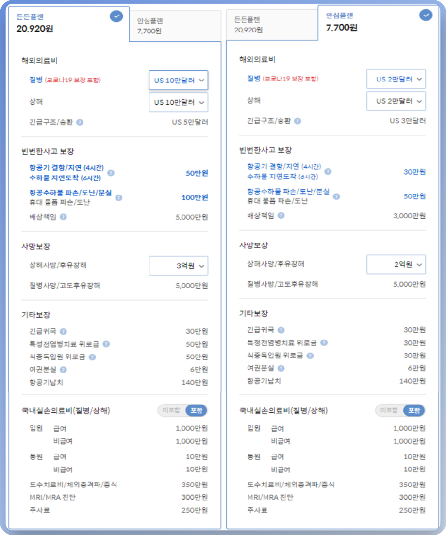 - 보장 옵션: 2만, 3만, 5만, 7만, 10만 달러