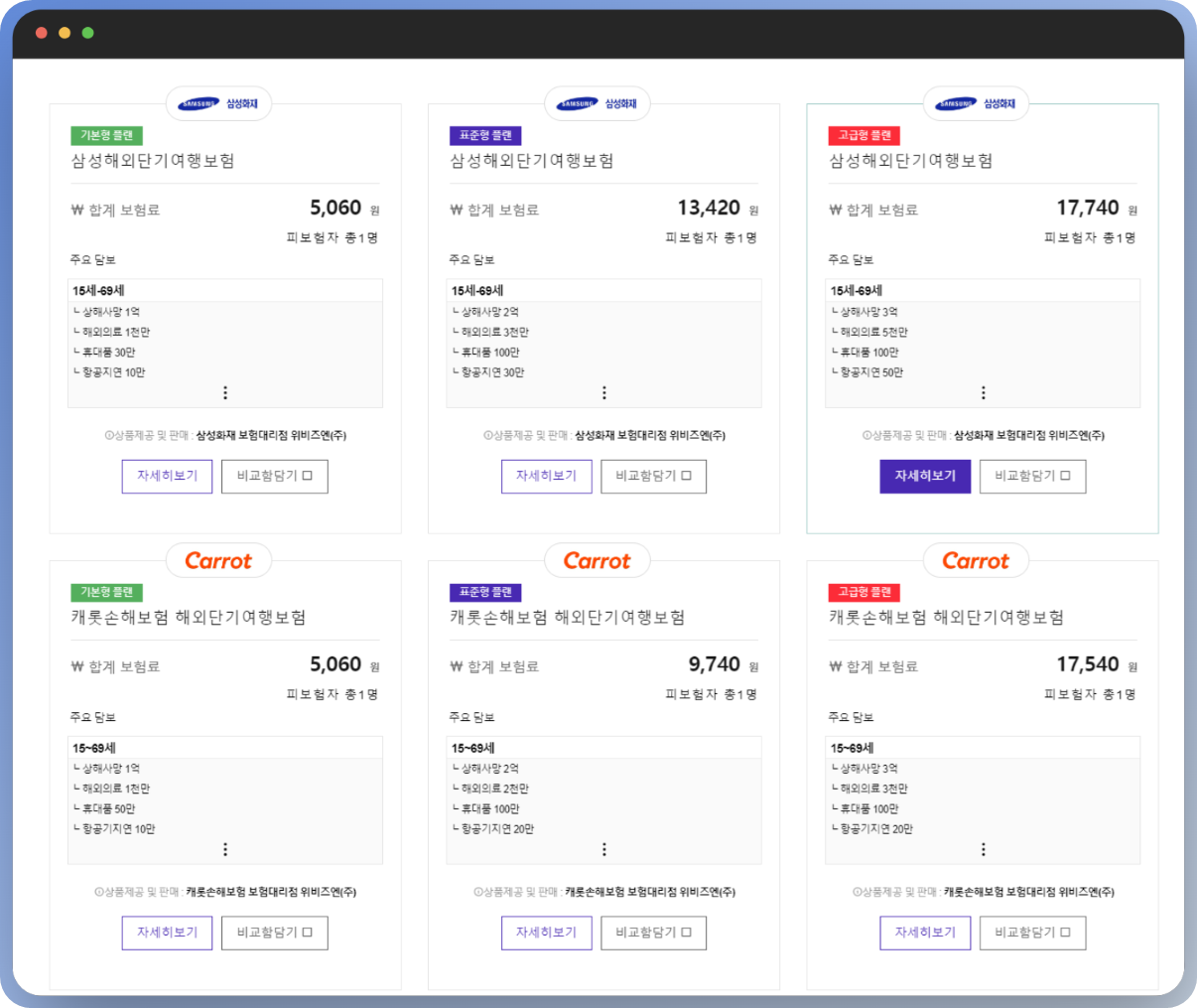 투어모즈를 통해 여행자 보험 비교를 하면 위 스냅숏처럼 한 번에 조회가 됩니다.