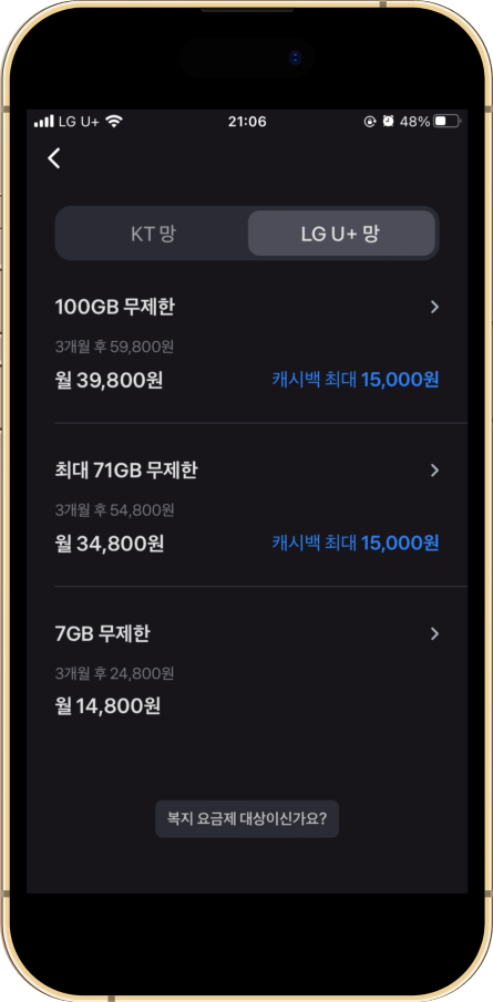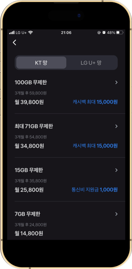 KT 통신망과 LG 통신망의 요금제는 15GB 요금제의 유무 외에는 요금, 캐시백 등 모든 내용이 동일합니다.