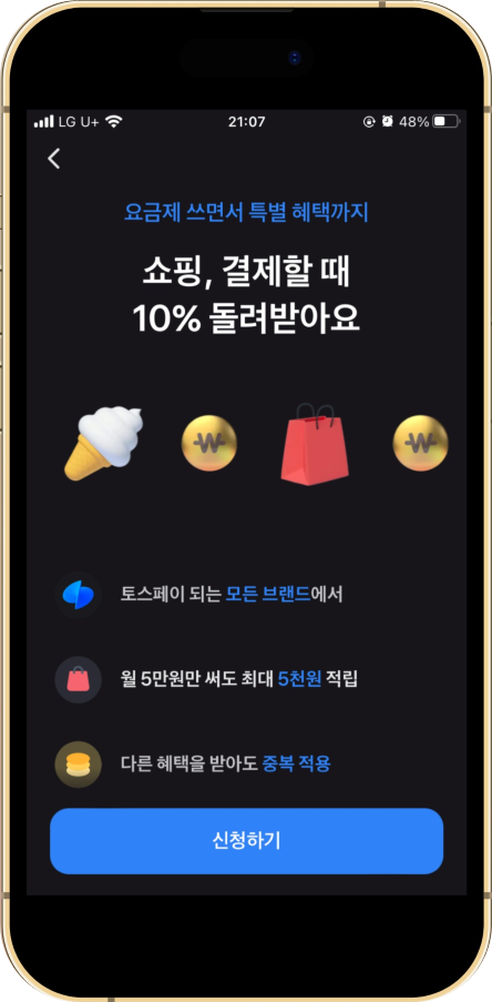통신 요금제를 쓰는 사용자에 한해 토스페이를 쓰면 10% 금액을 즉시 페이백 받을 수 있습니다. 월 최대 5,000원 할인됩니다.