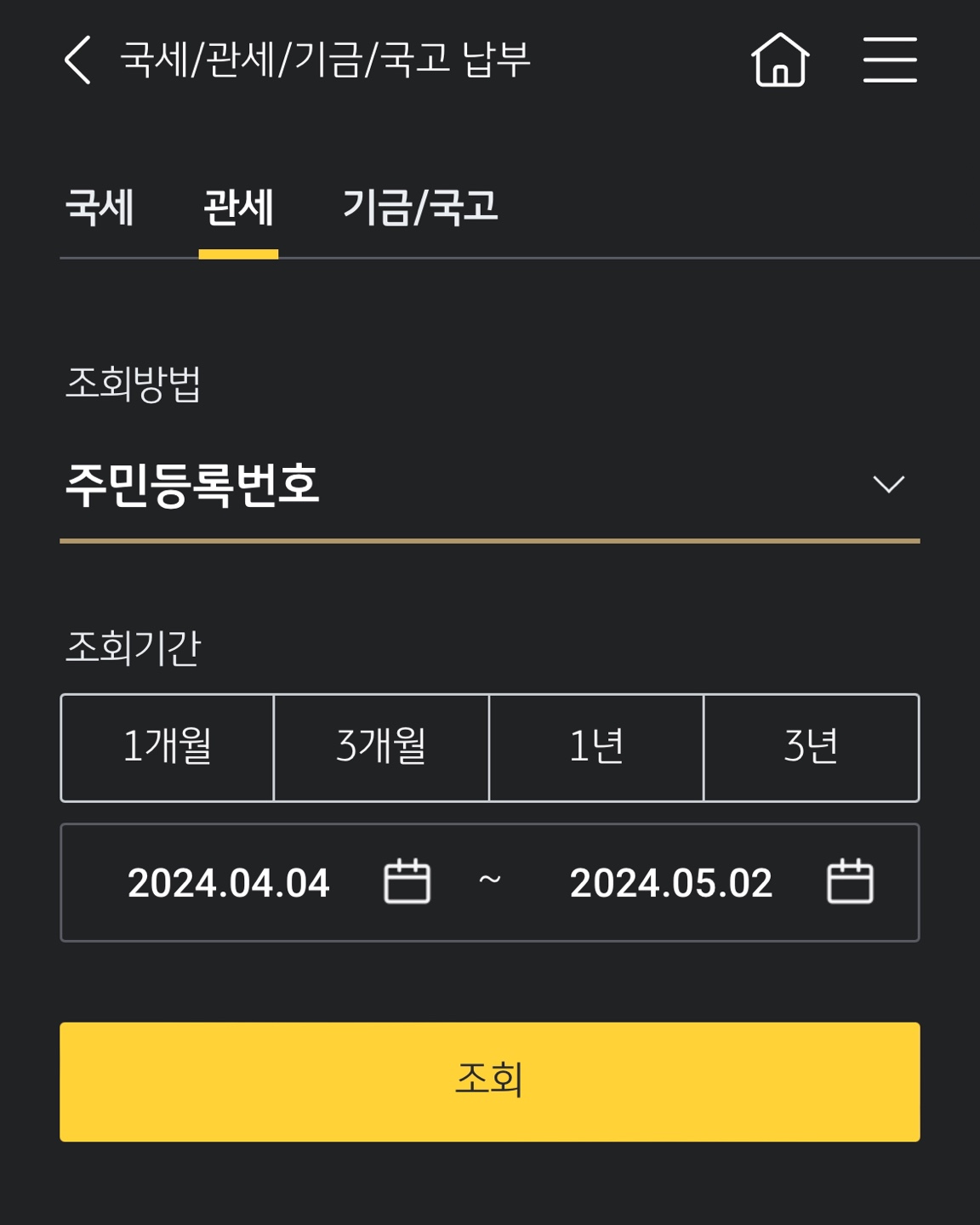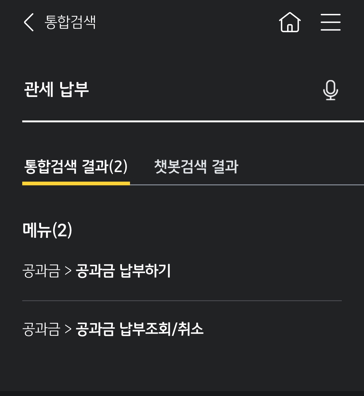 다음은 메뉴 검색 버튼을 눌러서 "관세 납부"를 검색해주세요.