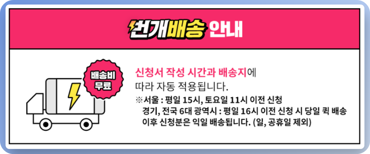 단, 번개배송에는 지역별 조건이 있습니다. 아래는 간략한 소개이므로 자세한 내용을 꼭 확인해 보세요.