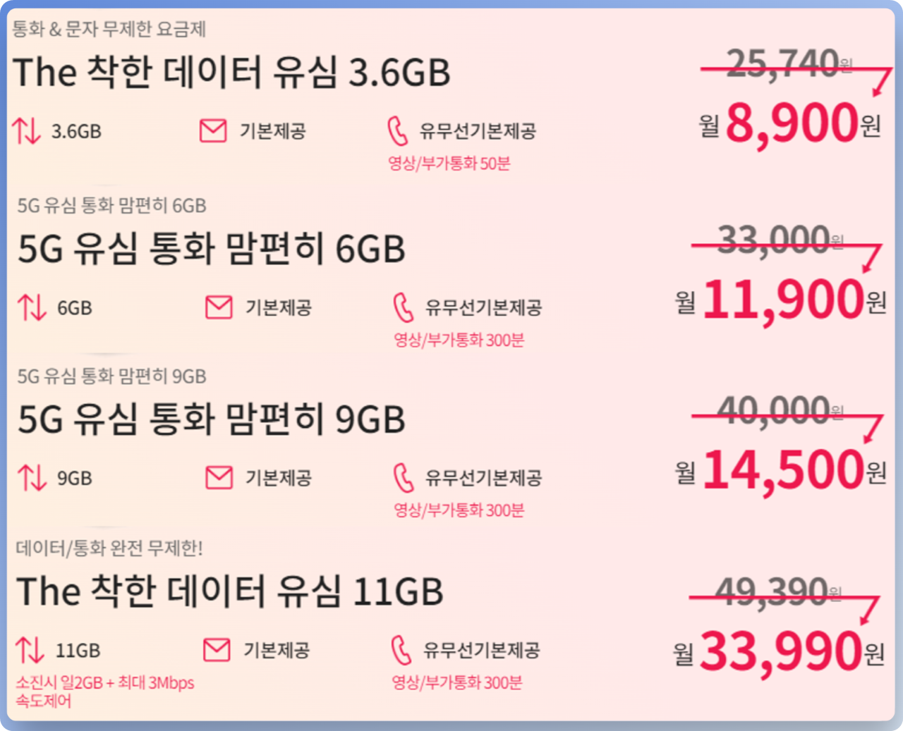 - 헬로모바일 : 기본료 11,000원 이상 요금제 (단말/유심 요금제 포함)