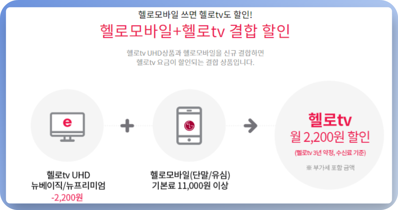 헬로모바일은 앞서 말씀드린 대로 LG헬로비전에서 운영하고 있습니다. 따라서 LG헬로비전의 인터넷이나 방송(TV)을 결합해 할인받는 유무선 결합할인이 가능합니다. 단, LG U+망, KT망 사용자만 가능하기 때문에 주의해 주세요. 또한 아래와 같은 결합 가능한 상품이 있으니 확인 필수입니다.