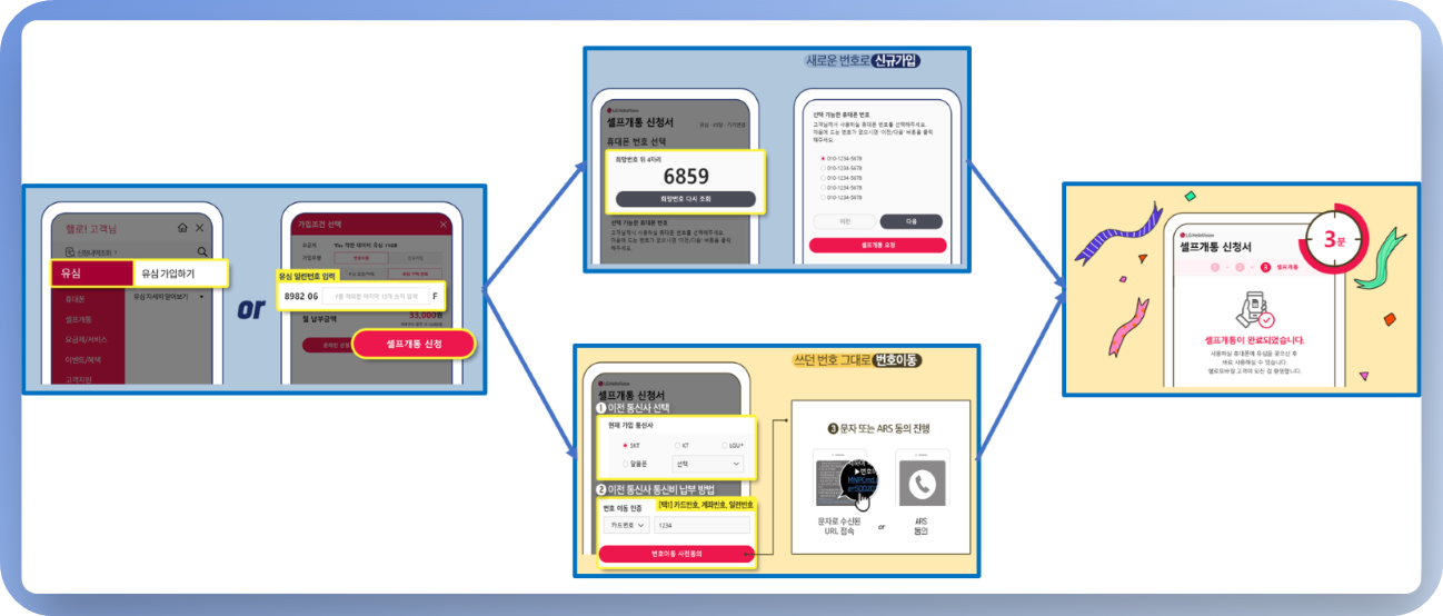 과정은 정말 간단합니다. 홈페이지나 모바일앱을 통해 "유심가입하기" 혹은 "셀프개통 신청"을 해줍니다. 그리고 본인인증 등의 과정을 진행하면 끝이죠. 개통 후 유심을 교체해 스마트폰을 몇 번 재시작해주시면 정상적으로 사용할 수 있습니다.