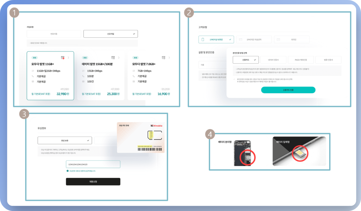 셀프 개통하는 방법은 위 스냅숏과 같으며, 순서대로 설명하자면 총 4단계로 이루어져 있습니다.