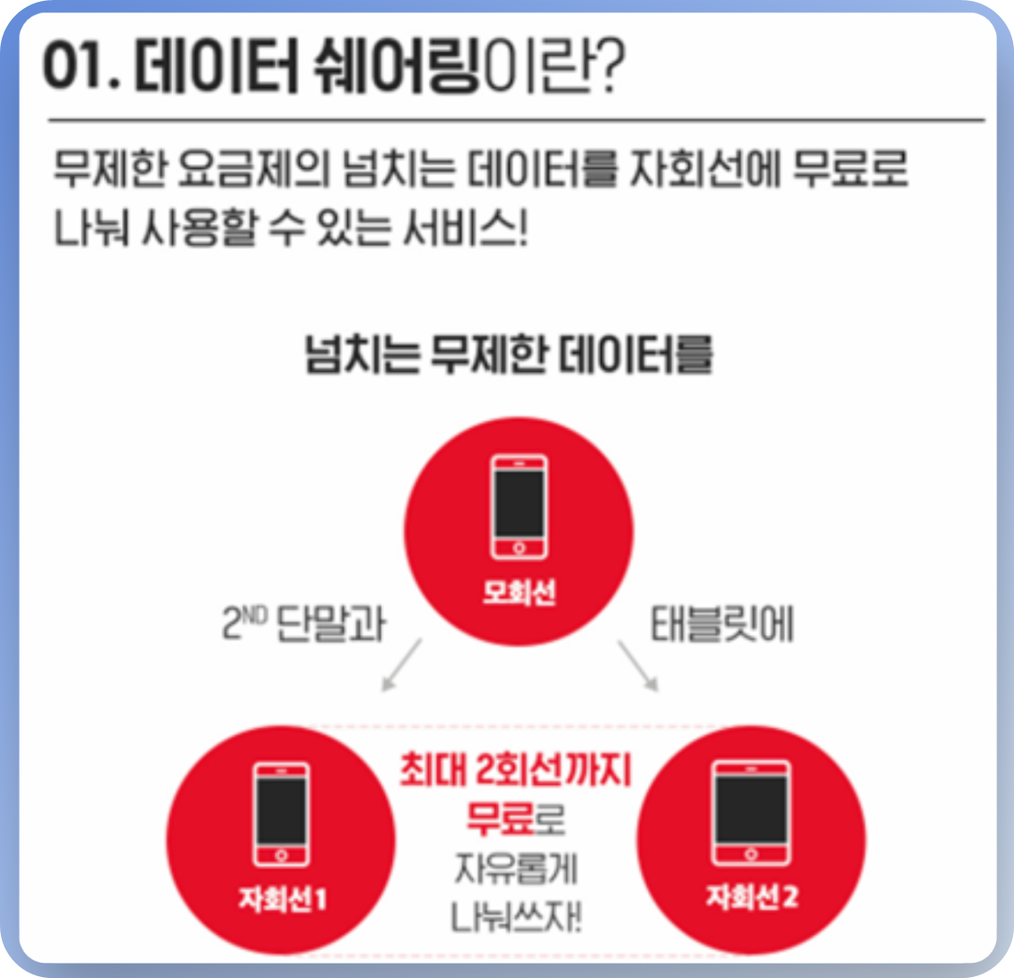 단, KT M 모바일의 데이터 쉐어링은 모든 요금제가 아닌 "데이터 쉐어링 가능 요금제"를 가입해야 이용 가능하며, 1회선은 무료로 제공하고 있습니다. 자세한 내용은 홈페이지를 통해서 확인하시기 바랍니다.
